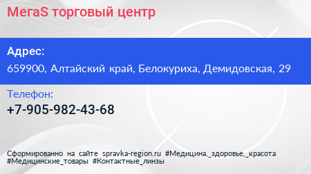 МегаS, торговый центр по адресу 659900, Алтайский край, Белокуриха, Демидовская, 29 в дальнейшем Организация, размещена в следующих категориях: