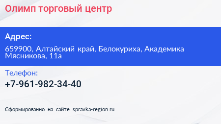 Олимп, торговый центр по адресу 659900, Алтайский край, Белокуриха, Академика Мясникова, 11а в дальнейшем Организация, размещена в следующих категориях: