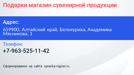 Подарки, магазин сувенирной продукции по адресу 659900, Алтайский край, Белокуриха, Академика Мясникова, 1 в дальнейшем Организация, размещена в следующих категориях:
