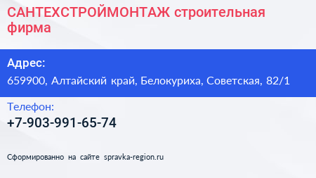 САНТЕХСТРОЙМОНТАЖ, строительная фирма по адресу 659900, Алтайский край, Белокуриха, Советская, 82/1 в дальнейшем Организация, размещена в следующих категориях: