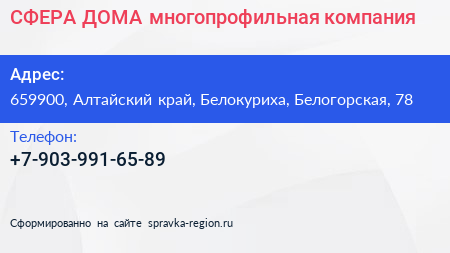 СФЕРА-ДОМА, многопрофильная компания по адресу 659900, Алтайский край, Белокуриха, Белогорская, 78 в дальнейшем Организация, размещена в следующих категориях: