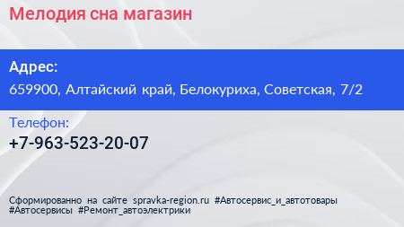 Мелодия сна, магазин по адресу 659900, Алтайский край, Белокуриха, Советская, 7/2 в дальнейшем Организация, размещена в следующих категориях: