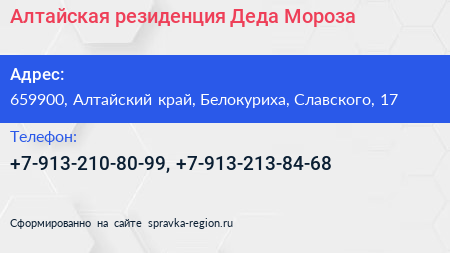 Алтайская резиденция Деда Мороза по адресу 659900, Алтайский край, Белокуриха, Славского, 17 в дальнейшем Организация, размещена в следующих категориях: