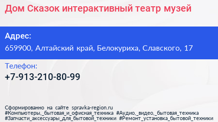 Дом Сказок, интерактивный театр-музей по адресу 659900, Алтайский край, Белокуриха, Славского, 17 в дальнейшем Организация, размещена в следующих категориях: