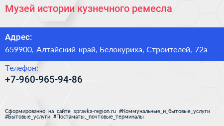 Музей истории кузнечного ремесла по адресу 659900, Алтайский край, Белокуриха, Строителей, 72а в дальнейшем Организация, размещена в следующих категориях:
