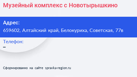 Музейный комплекс, с. Новотырышкино по адресу 659602, Алтайский край, Белокуриха, Советская, 77в в дальнейшем Организация, размещена в следующих категориях: