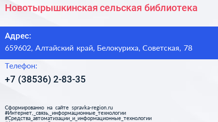 Новотырышкинская сельская библиотека по адресу 659602, Алтайский край, Белокуриха, Советская, 78 в дальнейшем Организация, размещена в следующих категориях: