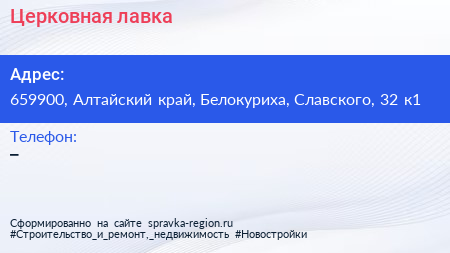 Церковная лавка по адресу 659900, Алтайский край, Белокуриха, Славского, 32 к1 в дальнейшем Организация, размещена в следующих категориях: