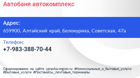 Автобаня, автокомплекс по адресу 659900, Алтайский край, Белокуриха, Советская, 47а в дальнейшем Организация, размещена в следующих категориях: