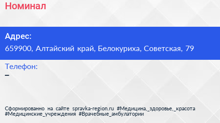 Номинал по адресу 659900, Алтайский край, Белокуриха, Советская, 79 в дальнейшем Организация, размещена в следующих категориях: