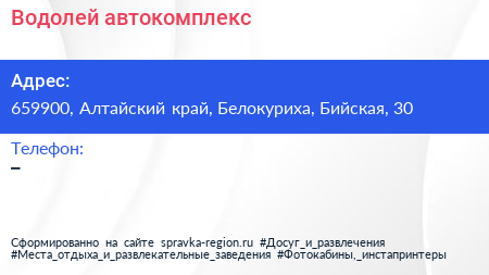 Водолей, автокомплекс по адресу 659900, Алтайский край, Белокуриха, Бийская, 30 в дальнейшем Организация, размещена в следующих категориях: