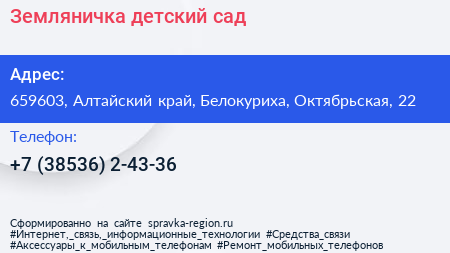 Земляничка, детский сад по адресу 659603, Алтайский край, Белокуриха, Октябрьская, 22 в дальнейшем Организация, размещена в следующих категориях: