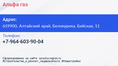 Альфа-газ по адресу 659900, Алтайский край, Белокуриха, Бийская, 11 в дальнейшем Организация, размещена в следующих категориях: