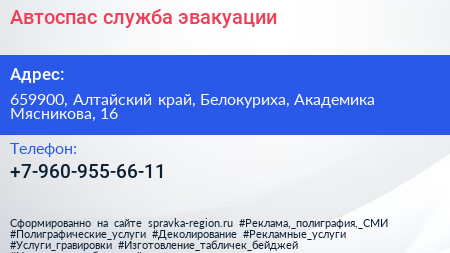 Автоспас, служба эвакуации по адресу 659900, Алтайский край, Белокуриха, Академика Мясникова, 16 в дальнейшем Организация, размещена в следующих категориях: