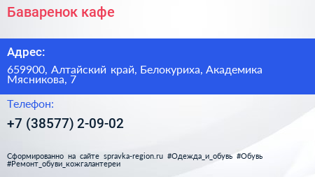 Баваренок, кафе по адресу 659900, Алтайский край, Белокуриха, Академика Мясникова, 7 в дальнейшем Организация, размещена в следующих категориях: