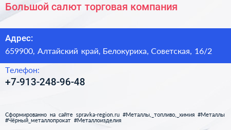 Большой салют, торговая компания по адресу 659900, Алтайский край, Белокуриха, Советская, 16/2 в дальнейшем Организация, размещена в следующих категориях: