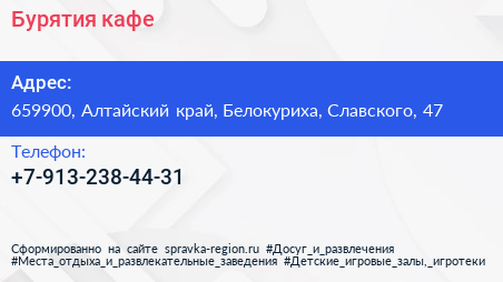 Бурятия, кафе по адресу 659900, Алтайский край, Белокуриха, Славского, 47 в дальнейшем Организация, размещена в следующих категориях: