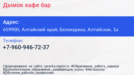 Дымок, кафе-бар по адресу 659900, Алтайский край, Белокуриха, Алтайская, 1а в дальнейшем Организация, размещена в следующих категориях: