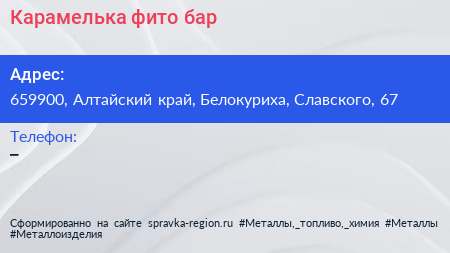 Карамелька, фито-бар по адресу 659900, Алтайский край, Белокуриха, Славского, 67 в дальнейшем Организация, размещена в следующих категориях: