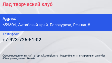 Лад, творческий клуб по адресу 659604, Алтайский край, Белокуриха, Речная, 8 в дальнейшем Организация, размещена в следующих категориях: