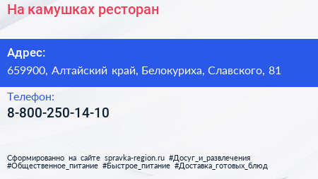 На камушках, ресторан по адресу 659900, Алтайский край, Белокуриха, Славского, 81 в дальнейшем Организация, размещена в следующих категориях: