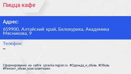 Пицца, кафе по адресу 659900, Алтайский край, Белокуриха, Академика Мясникова, 9 в дальнейшем Организация, размещена в следующих категориях: