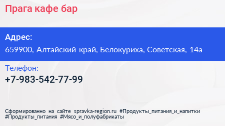 Прага, кафе-бар по адресу 659900, Алтайский край, Белокуриха, Советская, 14а в дальнейшем Организация, размещена в следующих категориях: