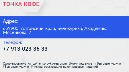 ТОЧКА КОФЕ по адресу 659900, Алтайский край, Белокуриха, Академика Мясникова, 7 в дальнейшем Организация, размещена в следующих категориях: