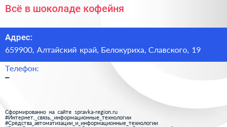 Всё в шоколаде, кофейня по адресу 659900, Алтайский край, Белокуриха, Славского, 19 в дальнейшем Организация, размещена в следующих категориях: