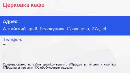 Церковка, кафе по адресу Алтайский край, Белокуриха, Славского, 77д к4 в дальнейшем Организация, размещена в следующих категориях: