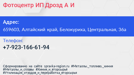Фотоцентр, ИП Дрозд А.И. по адресу 659603, Алтайский край, Белокуриха, Центральная, 36а в дальнейшем Организация, размещена в следующих категориях: