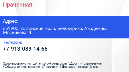 Прачечная по адресу 659900, Алтайский край, Белокуриха, Академика Мясникова, 4 в дальнейшем Организация, размещена в следующих категориях: