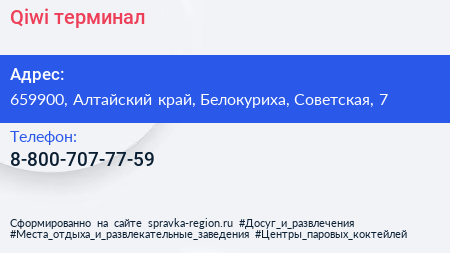 Qiwi, терминал по адресу 659900, Алтайский край, Белокуриха, Советская, 7 в дальнейшем Организация, размещена в следующих категориях: