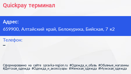 Quickpay, терминал по адресу 659900, Алтайский край, Белокуриха, Бийская, 7 к2 в дальнейшем Организация, размещена в следующих категориях: