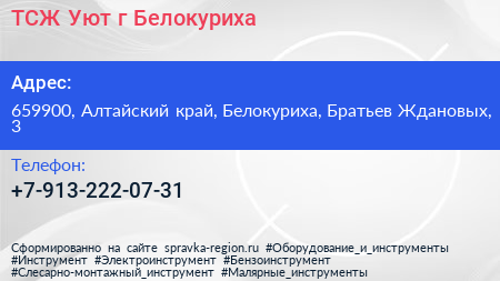 ТСЖ Уют, г. Белокуриха по адресу 659900, Алтайский край, Белокуриха, Братьев Ждановых, 3 в дальнейшем Организация, размещена в следующих категориях: