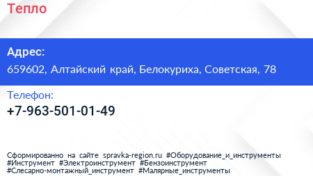 Тепло по адресу 659602, Алтайский край, Белокуриха, Советская, 78 в дальнейшем Организация, размещена в следующих категориях: