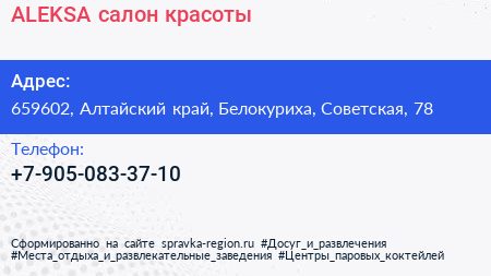 ALEKSA, салон красоты по адресу 659602, Алтайский край, Белокуриха, Советская, 78 в дальнейшем Организация, размещена в следующих категориях: