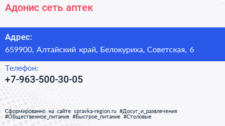 Адонис, сеть аптек по адресу 659900, Алтайский край, Белокуриха, Советская, 6 в дальнейшем Организация, размещена в следующих категориях:
