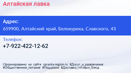 Алтайская лавка по адресу 659900, Алтайский край, Белокуриха, Славского, 43 в дальнейшем Организация, размещена в следующих категориях: