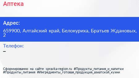 Аптека по адресу 659900, Алтайский край, Белокуриха, Братьев Ждановых, 2 в дальнейшем Организация, размещена в следующих категориях: