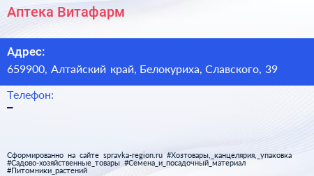 Аптека Витафарм по адресу 659900, Алтайский край, Белокуриха, Славского, 39 в дальнейшем Организация, размещена в следующих категориях: