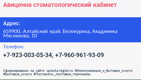 Авиценна, стоматологический кабинет по адресу 659900, Алтайский край, Белокуриха, Академика Мясникова, 10 в дальнейшем Организация, размещена в следующих категориях: