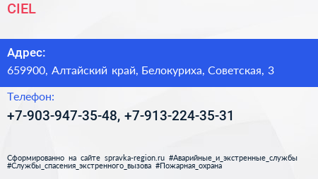 CIEL по адресу 659900, Алтайский край, Белокуриха, Советская, 3 в дальнейшем Организация, размещена в следующих категориях: