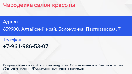 Чародейка, салон красоты по адресу 659900, Алтайский край, Белокуриха, Партизанская, 7 в дальнейшем Организация, размещена в следующих категориях: