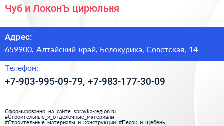 Чуб и ЛоконЪ, цирюльня по адресу 659900, Алтайский край, Белокуриха, Советская, 14 в дальнейшем Организация, размещена в следующих категориях: