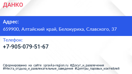 ДАНКО по адресу 659900, Алтайский край, Белокуриха, Славского, 37 в дальнейшем Организация, размещена в следующих категориях:
