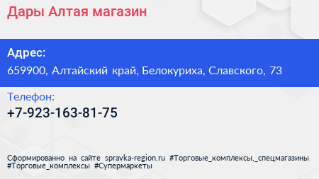 Дары Алтая, магазин по адресу 659900, Алтайский край, Белокуриха, Славского, 73 в дальнейшем Организация, размещена в следующих категориях: