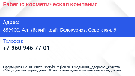 Faberlic, косметическая компания по адресу 659900, Алтайский край, Белокуриха, Советская, 9 в дальнейшем Организация, размещена в следующих категориях: