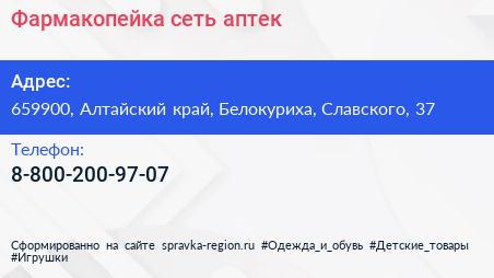 Фармакопейка, сеть аптек по адресу 659900, Алтайский край, Белокуриха, Славского, 37 в дальнейшем Организация, размещена в следующих категориях: