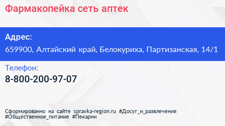 Фармакопейка, сеть аптек по адресу 659900, Алтайский край, Белокуриха, Партизанская, 14/1 в дальнейшем Организация, размещена в следующих категориях: